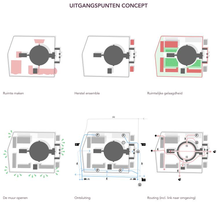 Het gebied tussen de monumentale gebouwen en de ringmuur wordt vrijgemaakt door sloop van de gebouwen uit 2000-2005. De ringmuur wordt hersteld. Het oorspronkelijke ensemble aan de oostzijde wordt hersteld door het realiseren van twee nieuwe bouwvolumes.
