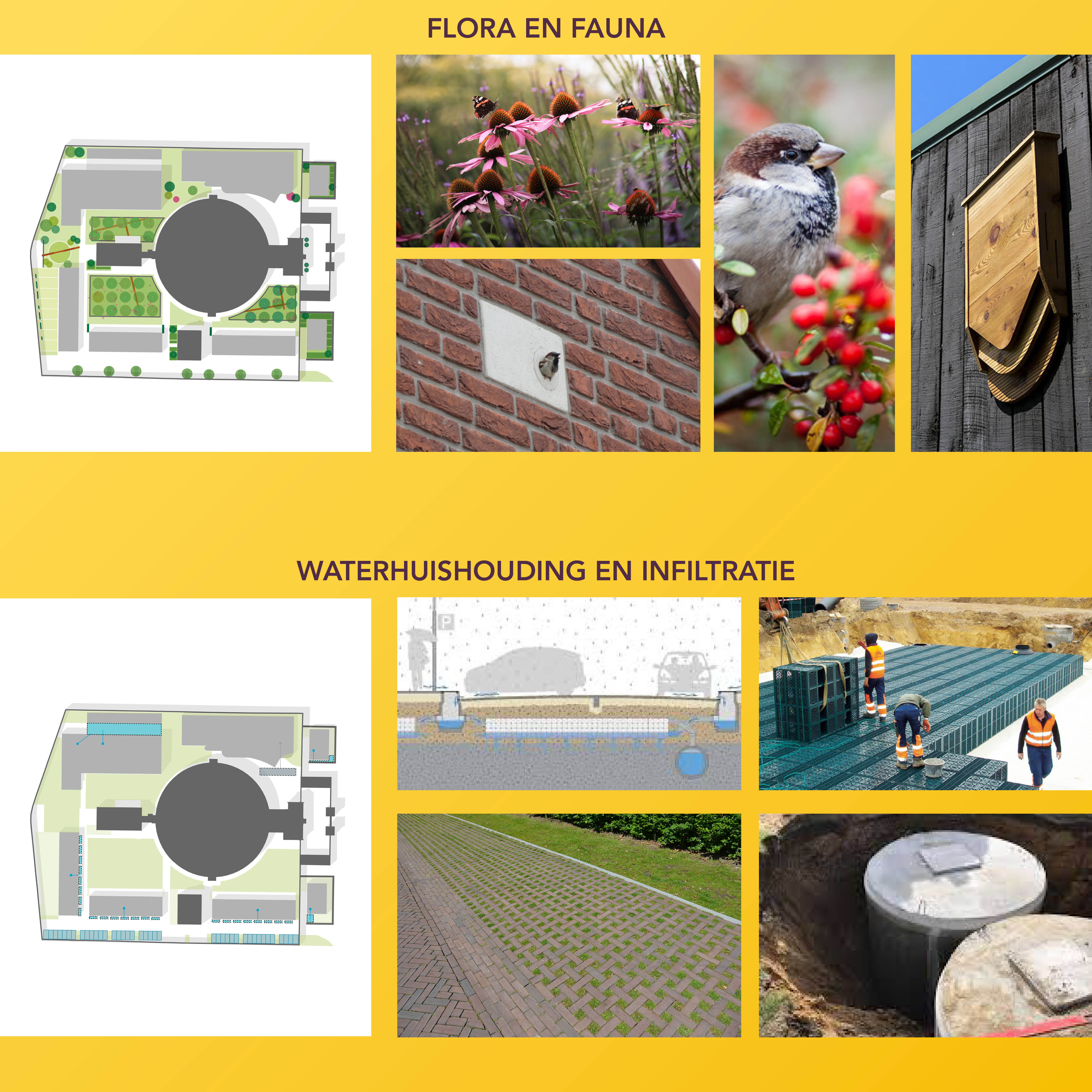 Het vergroenen van het terrein komt de biodiversiteit ten goede. Voor de tuinen worden beplanting en bomen geselecteerd die interessant zijn voor bijen en vlinders. De hagen rondom zijn aantrekkelijk voor kleine zoogdieren en vogels. Dit groen bestaat voornamelijk uit inheemse planten, bomen en struiken. Omdat daar de inheemse dieren (o.a. wilde bijen, vlinders) van afhankelijk zijn. Door in gevels van de nieuwbouw ook voorzieningen op te nemen zoals insectenhotels of vogelhuisjes ontstaat een natuur-inclusief geheel.